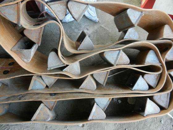 理論計算中安全係數的選擇要結合物料特性裝載方式及卸載方式。對於采用挖料式裝載時,主要為粉末狀、顆粒狀、小塊狀的無磨琢性的散狀物料,挖料時不會產生很大的阻力,且備鬥間距較大,允許提升帶和備鬥的運行線速度較高(一般可以為0.8一3.5耐5),同時為避免超載和物料撒落,應使挖取的物料麵高度低於拉緊輪軸所在的水平麵,此時安全係數應考慮取中間值;對於容重較大、磨琢性大的物料,應考慮采用流人式裝載方式,備鬥應連續、密集地布置,並取較低的運行線速度(一般小於1.0而5),且運動方向應迎向物料流動方向,供料口下緣的位置要高於拉緊輪軸所在的水平麵,此時承受的衝擊載荷較大,安全係數應考慮取高值。