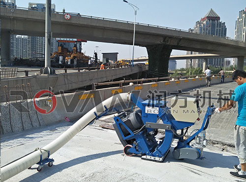 2、基層處理設備采用具備同步清除浮漿及吸塵功能的設備、帶有驅動行走係統的自循環回收的拋丸設備來進行橋麵混凝土基層處理。